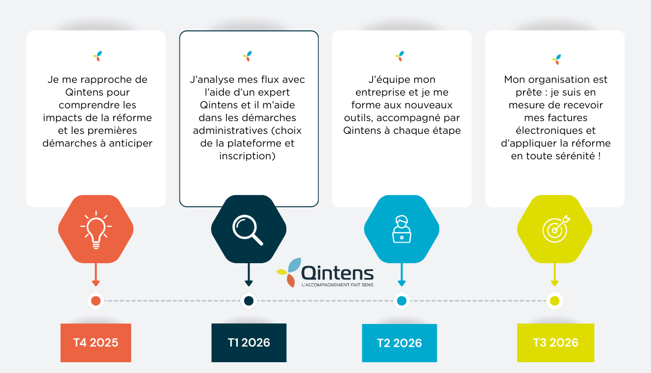 Pour vous aider à anticiper ces échéances, les équipes du cabinet Qintens vous accompagnent pas à pas tout au long de la transition pour vous aider à vous préparer sereinement à la facturation électronique :